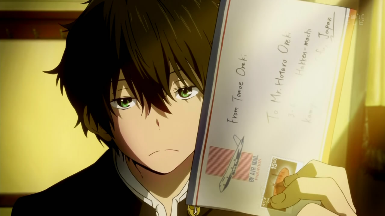 Apathetic high school student Houtarou Oreki joins his school's Classic Literature Club upon his sister's request. He expects to be the club's only member. However, he soon learns that the club already has one member: The ever-curious girl named Eru Chitanda.